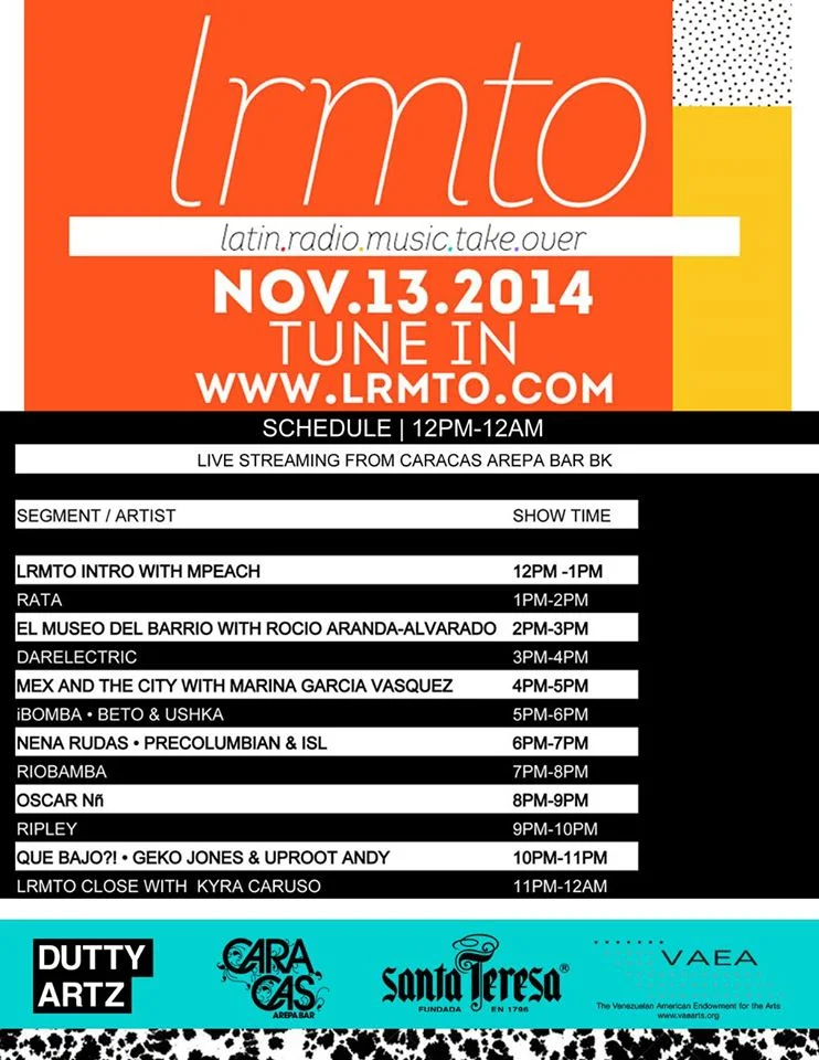 Honored2 be part of Latin Radio Music Take Over, organized by boss mama MPEACH this Thursday live/direct from Caracas Arepa Bar in Brooklyn. Tune in all day-- I'll be on 7 - 8 PM <3